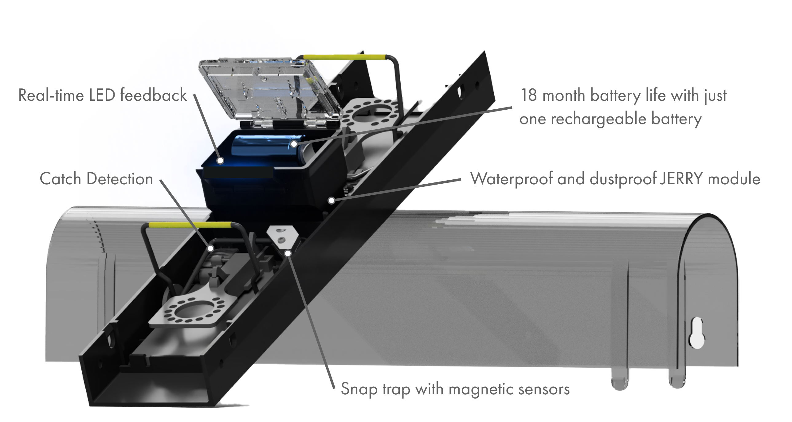 The JERRY module sits in the snap trap tunnel or the rat box and measures its triggering state. This is made possible by a magnet attached to the snap trap: If the magnet moves away from the JERRY module when the snap trap triggers, the sensor sounds an alarm.